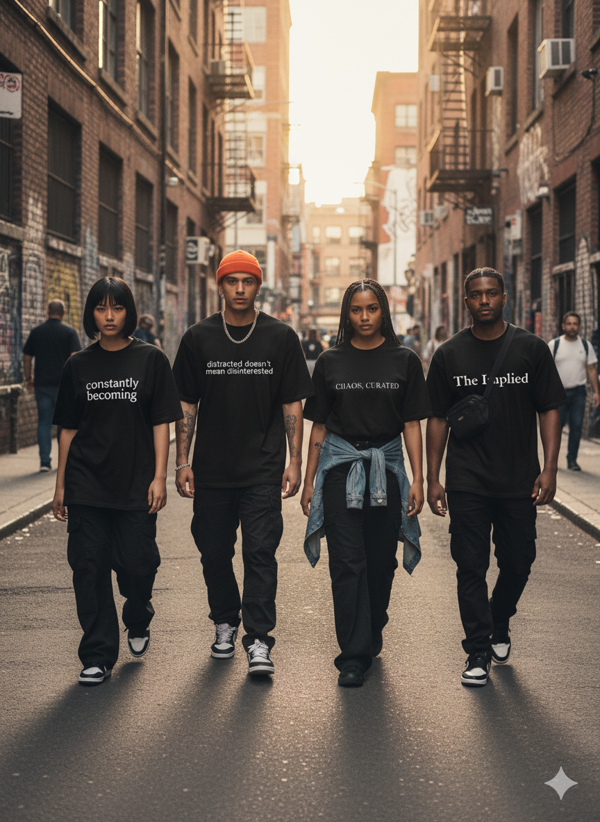 We're the first streetwear brand designed specifically for men's mental health - where typography becomes therapy and fashion becomes dialogue. Each piece carries the words you think but don't say, creating connection through shared experience.